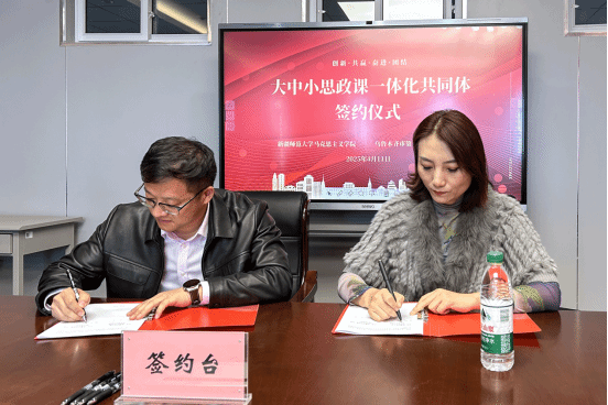 为深入贯彻落实习近平总书记关于“深入推进大中小学思想政治教育一体化建设”的重要指示精神,充分整合高校马院与优质中学在教学科研、人才培育等层面的优势资源,携手推动大中小学思政课一体化建设进程,4月11日,学院与乌鲁木齐市第一中学(河马泉校区)成功举行了共建“思政课一体化共同体”签约仪式。乌鲁木齐市第一中学(河马泉校区)校长韩宜飞,学院副院长罗志佳,思想政治教育系主任谢玲以及两校教师代表参加,乌鲁木齐市第一中学(河马泉校区)校长韩宜飞主持活动。